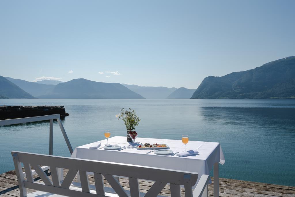 Hofslund Fjord Hotel ligg idyllisk til nede ved sjøen, og utsikten over fjorden og fjella omkring er storslagen.